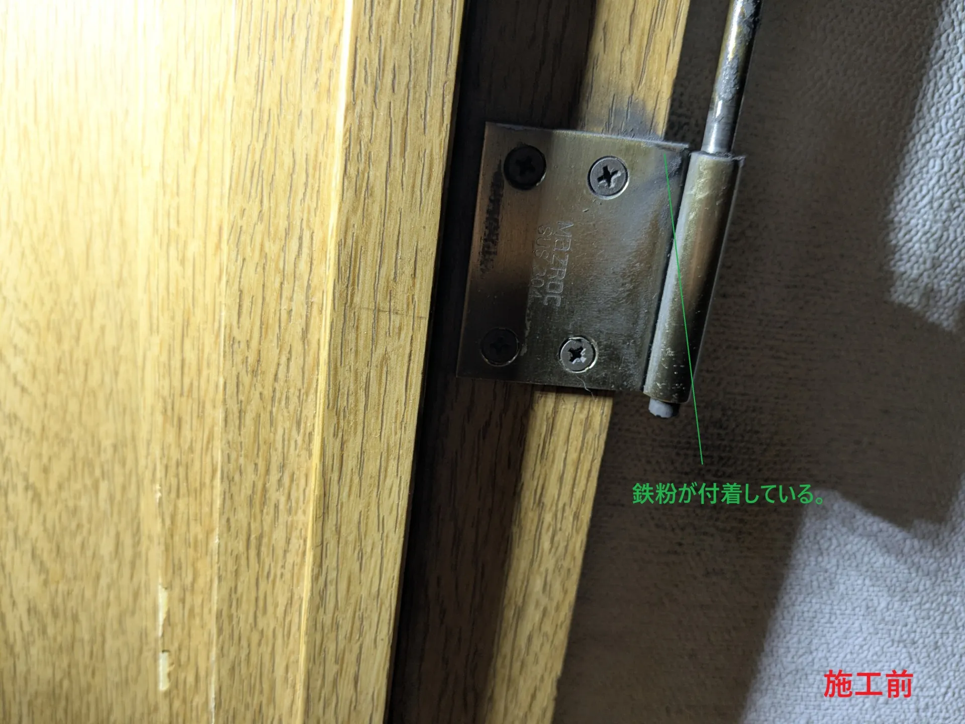 丁番を見てみますと、枠側の丁番に金属粉が付着しております。丁番を固定している