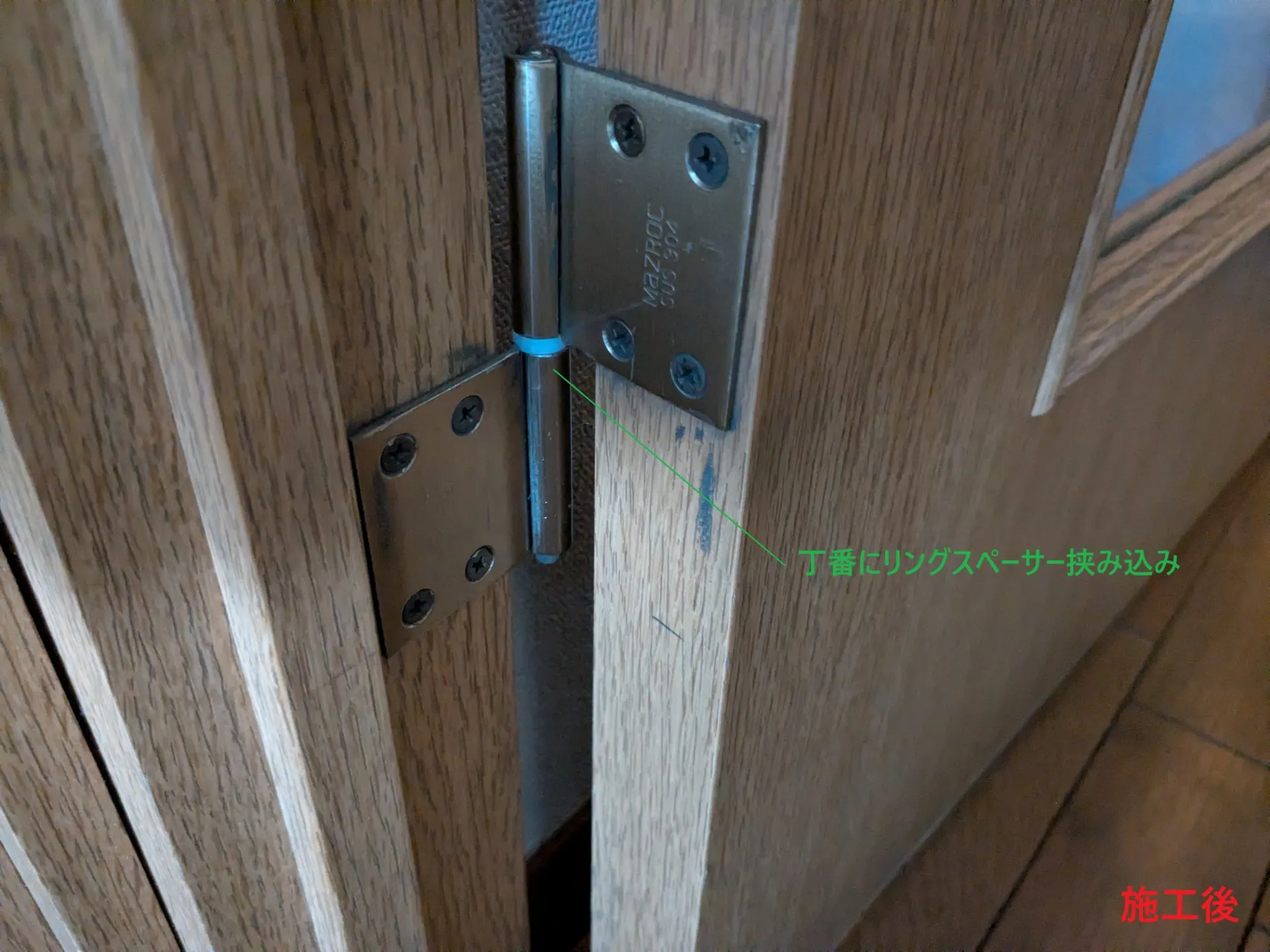 本来ならば丁番を取り替える対策を行うべきなのですが、お施主様と相談した結果