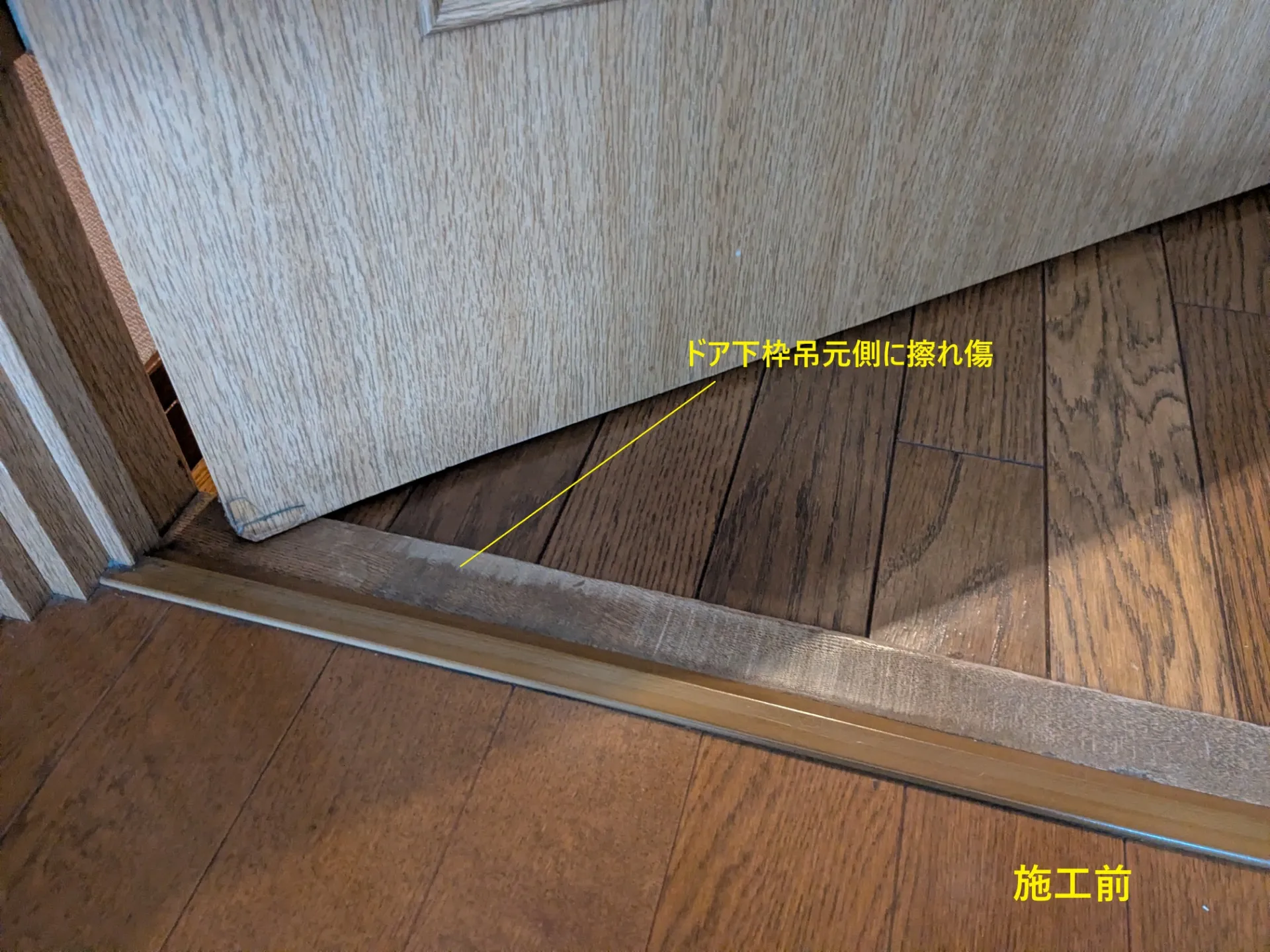 「室内ドアが閉まらない!」という問い合わせをいただき現地を見させていただきました。下枠吊元側にドア本体が擦れた跡が有ります。丁番を見てみますと、枠側の丁番に金属粉が付着しております。丁番を…